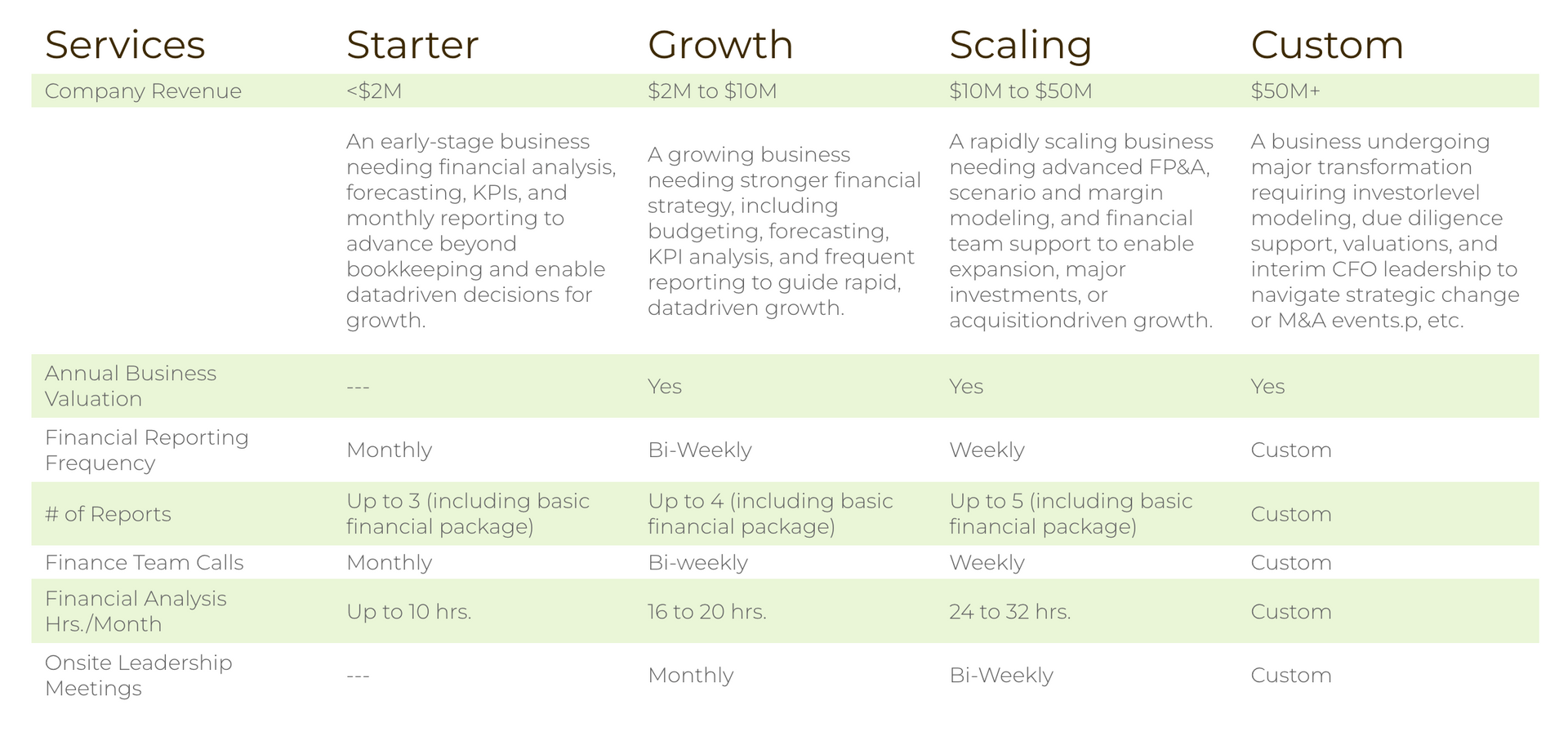 As your business grows, the data and reporting needs of key decision makers evolve. Owners / CEOs move from needing "backward looking" basic financial reports to "forward looking" financial intelligence in the form of forecasts, models, and scenarios to drive proactive decisions and support agile planning. Our Fractional CFO teams are designed to be the Owner / CEO executive partner that is looking at the horizon and guiding the business.